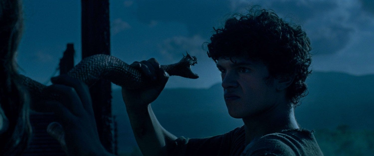 In the third act, The Carpenter’s Son pushes Joseph’s internal struggle to both a physical and theological climax. When a snake bites Joseph’s leg (with echoes of Gen 3:14-15), Jesus arrives and demands that Joseph tell him who his Father is. Hesitant, due in large part to his belief that to speak God’s name is a sin, Joseph finally admits that Yahweh is Jesus’s Father. Only then does Jesus heal the snakebite, as if to tie Joseph’s physical healing to his spiritual breakthrough and echo Christ’s words in the gospels, “Your faith has healed you.” The snake, in this context, becomes a metaphor for how sin was closing Joseph off to God’s new work in Jesus.